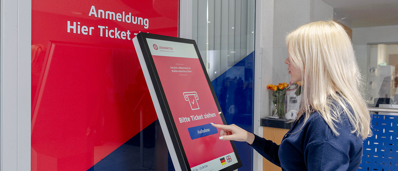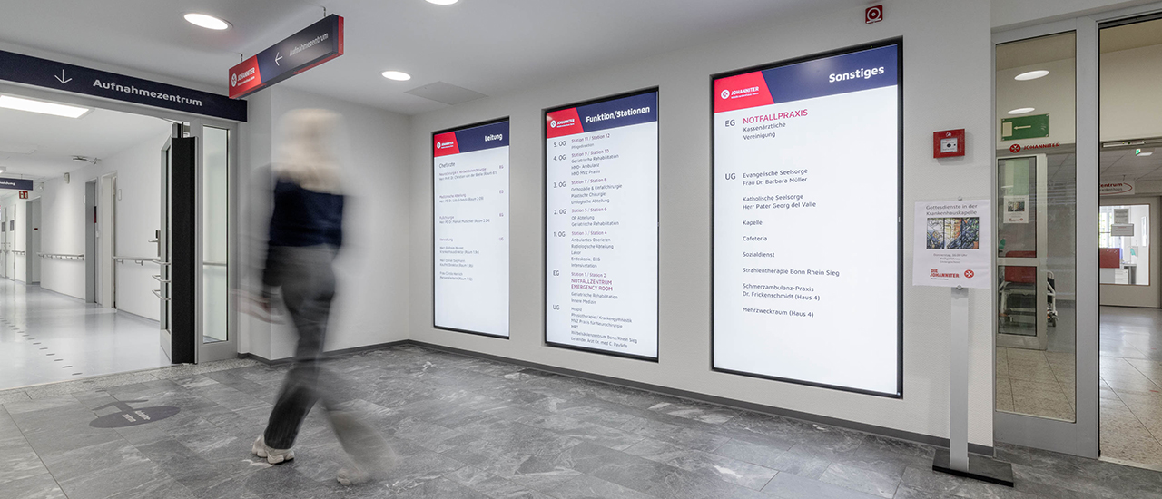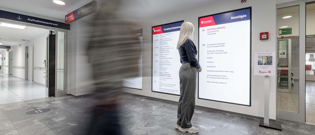 Im Zuge einer baulichen Umstrukturierung entstand ein neues Notfallzentrum in einem separaten Gebäudetrakt. In diesem Rahmen wurden auch die bisherigen statischen Etagenhinweise durch drei großformatige 86-Zoll-Displays im Eingangsbereich ersetzt. Diese zeigen aktuelle Übersichten über Fachabteilungen und zuständige Ärzt:innen – jederzeit durch das Klinikpersonal selbstständig aktualisierbar. Ein großer Vorteil, da sich Zuständigkeiten und Wege in Krankenhäusern häufig ändern.