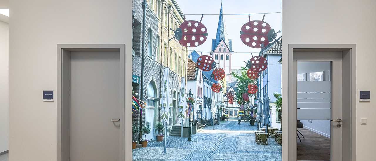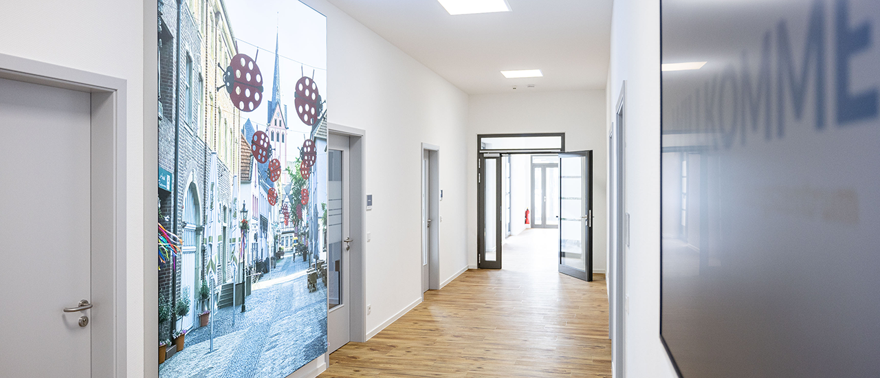 Für die neu eröffnete Pflegeschule Bork in Kempen realisierte die BlaueErdbeere ein ganzheitliches Werbe- und Orientierungskonzept – statisch und digital. Im Fokus stand die Kombination aus funktionaler Wegeleitung, klarer Markenpräsenz und gestalterischer Innenraumaufwertung – abgestimmt auf die Bedürfnisse eines modernen Bildungsstandorts.