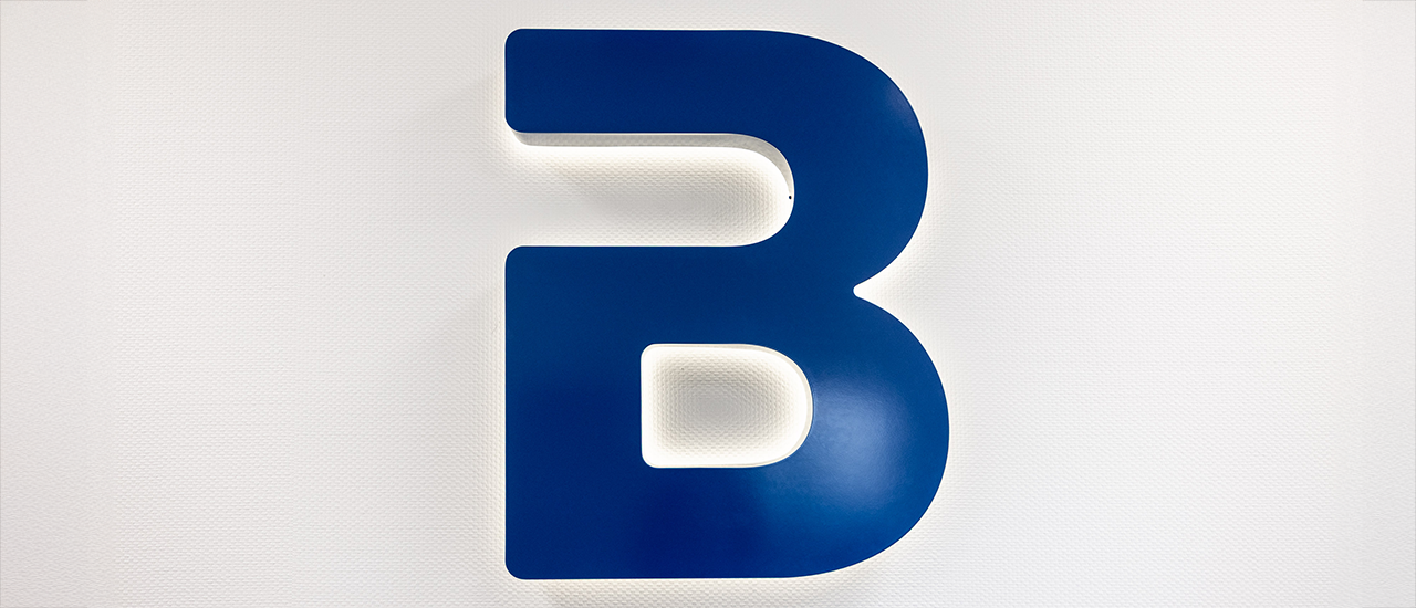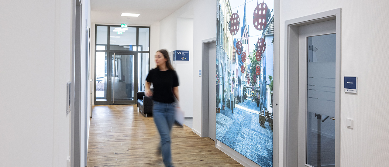 • Innenraumgestaltung: Die Schulungsräume erhielten transluzente Glasdekorfolien – für optimalen Lichteinfall bei gleichzeitigem Sichtschutz. Im Innenbereich wurde zudem ein hinterleuchtetes Wandbranding (Profil 3) installiert, ergänzt durch akustisch wirksame Echtholzpaneele.