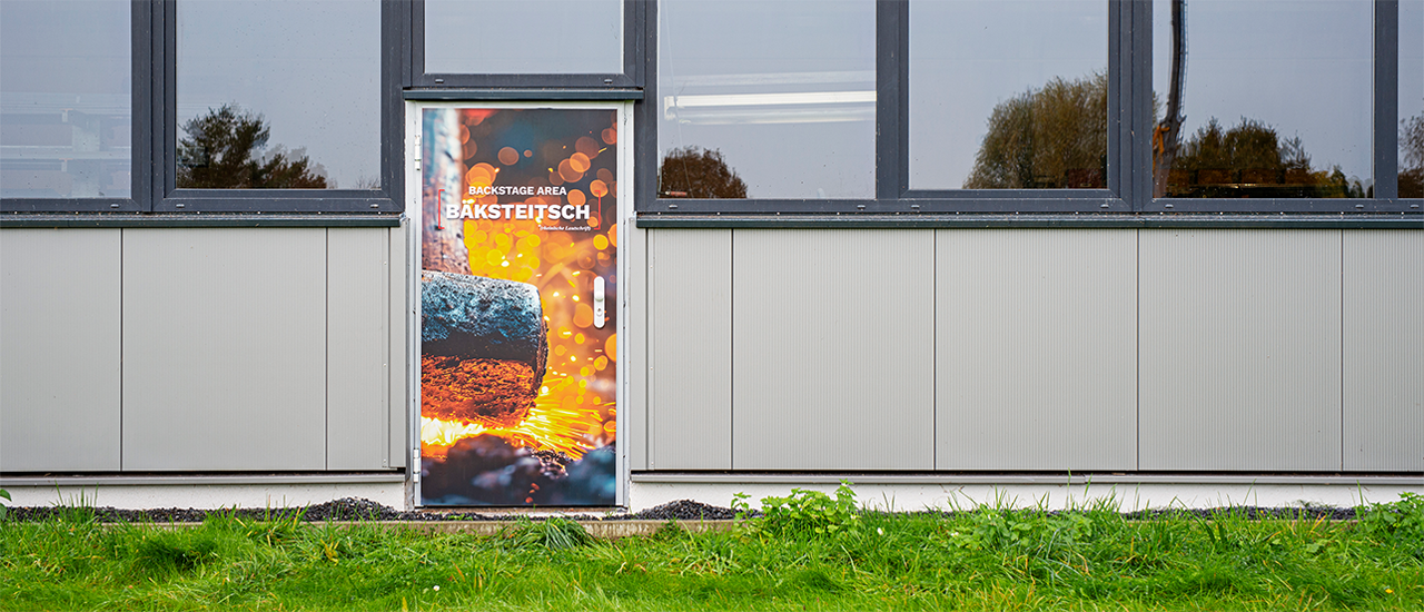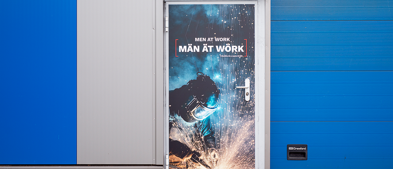 Die Hallen selbst wurden mit großflächigen Logos und gut sichtbaren Nummern versehen – perfekt für alle, die lieber schnell finden statt lange suchen. Ein besonderes Highlight: die „Män ät Wörk“-Motivfolien an allen Fassadentüren. Mit einem Augenzwinkern repräsentieren sie das Portfolio von Booms Pastoors – sympathisch, selbstbewusst und absolut markenkonform. Und weil gutes Design auch langlebig sein muss, kam bei allem eine digital bedruckte Hochleistungsfolie GHT mit mattem UV-Schutzlaminat zum Einsatz. Sieht gut aus, hält noch besser.